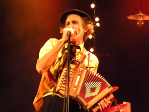 Auteur et interprète de chansons sulfureuses. Monté sur ressorts, c’est le clown et la pile, l’âme et l’épée, la potion et le verbe acéré des 3 Moustiq'R. Sur scène, il se défringue à cour, se rhabille à jardin, revient hurler à la rampe, éperonne le spectacle qu’il tient d’une main de maître. Il chante, fatigue les soufflets de son accordéon, poumon de l’orchestre, piano du pauvre qui l’accompagne. Saltimbanque dans l’âme, comédien de rue, il dirige la compagnie Transe express dont il écrit et conçoit la plupart des spectacles.